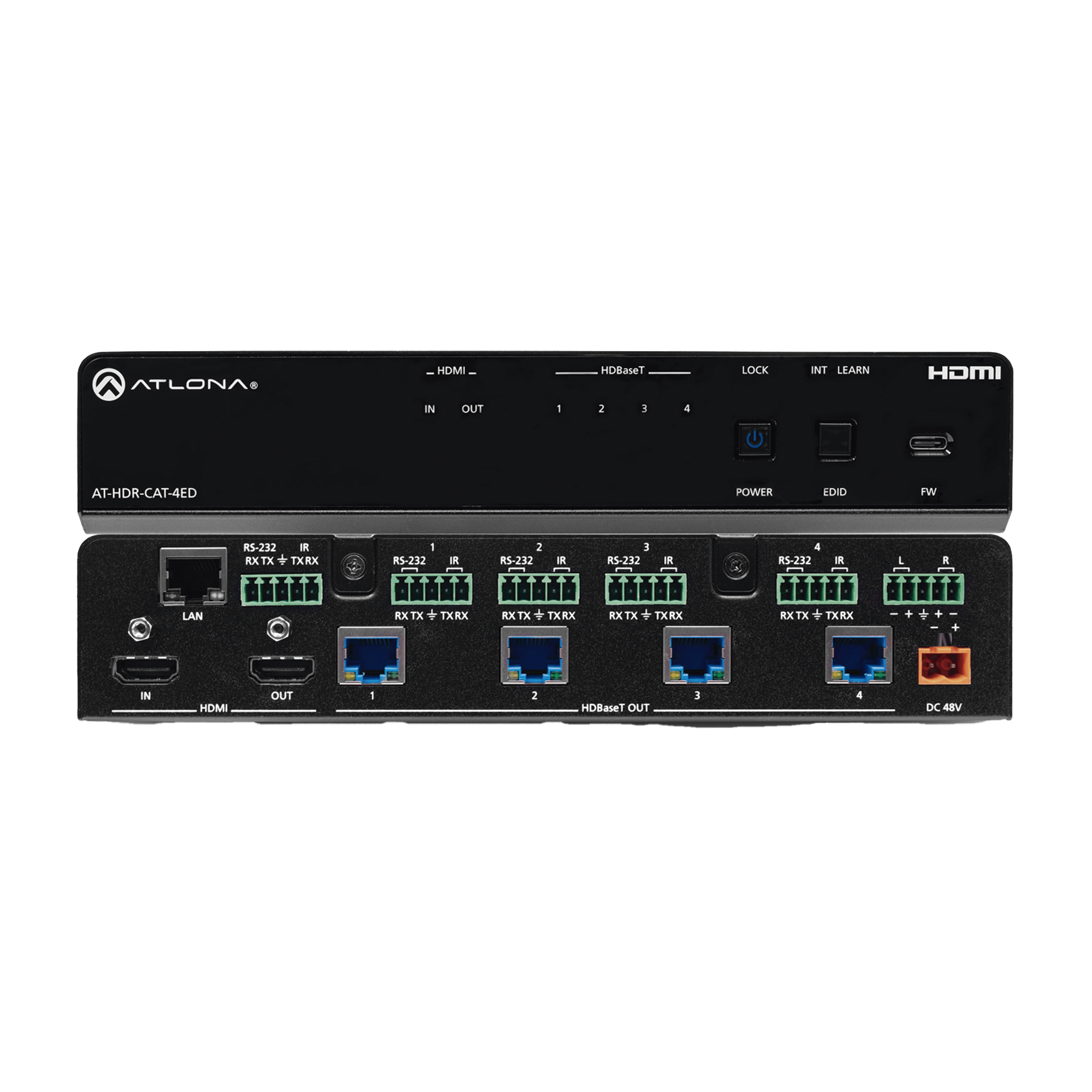 El Atlona AT-HDR-CAT-4ED es un amplificador de distribución de alto rango dinámico (HDR) con una entrada HDMI® y cuatro salidas HDBaseT™ de distancia extendida. Cada salida transmite vídeo 4K/UHD a 60 Hz con croma 4:4:4 muestreo más soporte para formatos HDR, audio multicanal, Ethernet, señales de control y alimentación de hasta 330 pies. (100 m) sobre cable de categoría 6/6A. El HDR-CAT-4ED presenta capacidades de integración sofisticadas diseñadas para aplicaciones comerciales de distribución AV que incluyen paso HDMI, desincrustación de audio, gestión EDID, Control de pantalla CEC, extensión de control RS-232 e IR, alimentación remota para receptores y prueba de enlace HDBaseT. Él ofrece compatibilidad con cualquier sistema de control TCP/IP o RS-232 y está alojado en un gabinete de 1U de ancho de medio rack con fuente de alimentación universal externa. El HDR-CAT-4ED es ideal para enviar contenido HDR y 4K/60 4:4:4 a receptores AT-HDR-EX 100CEA-RX.