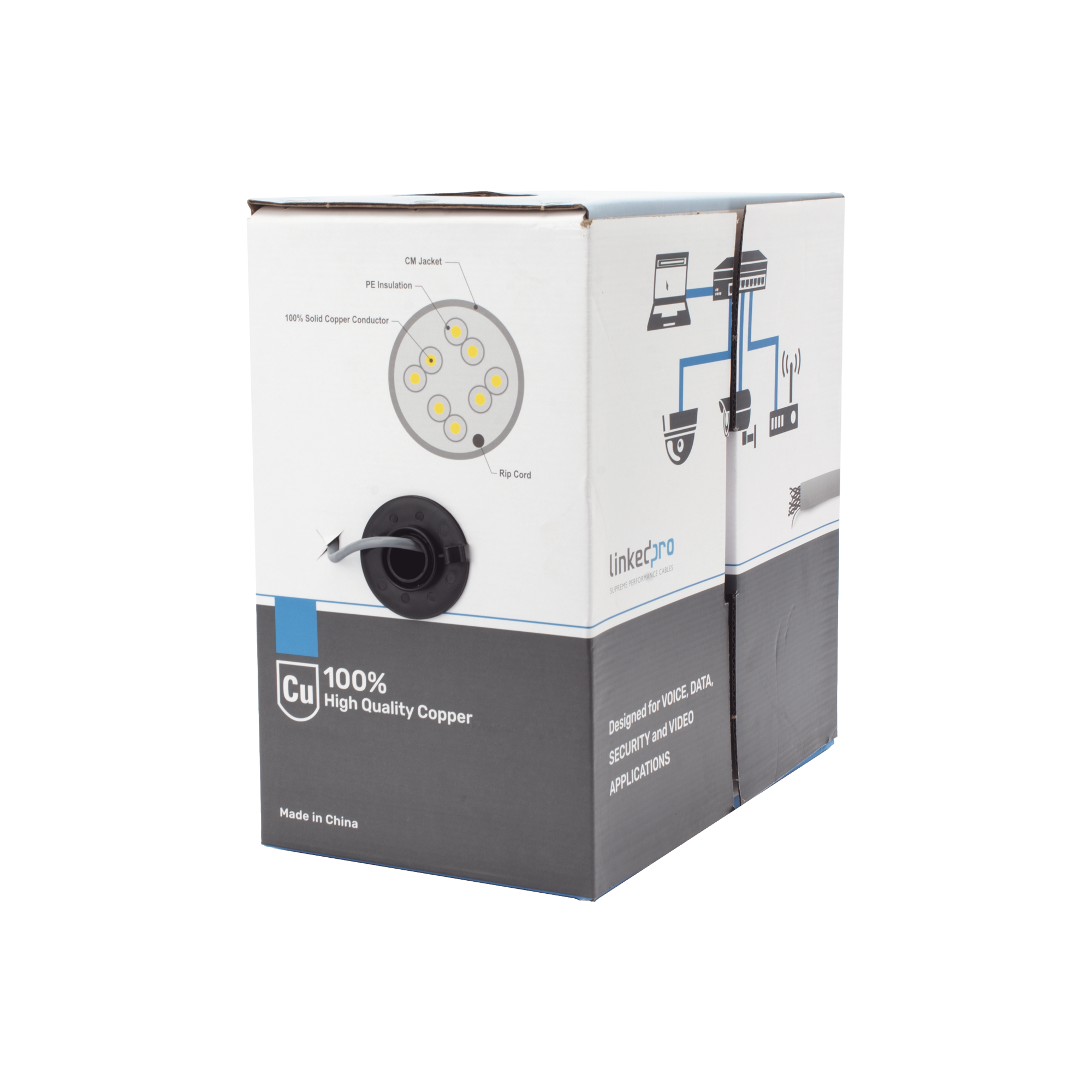 Bobina de cable de 305 m, ( 1000 ft ), Cat5e, alto desempeño, de color Gris, UL, para aplicaciones en video vigilancia, redes de datos. Uso Interior