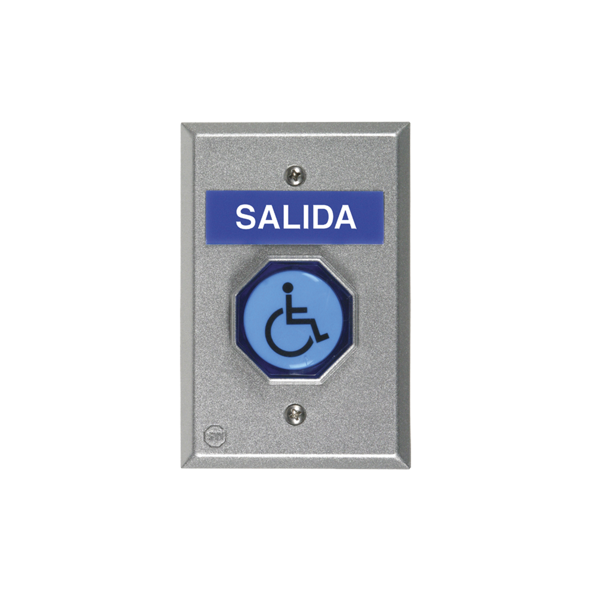 - Incluye cinco insertos para el pulsador – SALIDA, OPRIMA, EMPUJAR PARA SALIR, símbolo de discapacitado o en blanco.