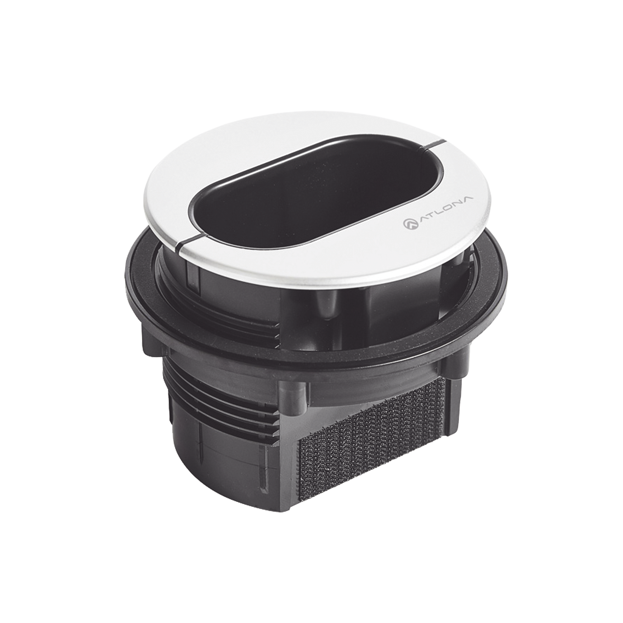 La Atlona Pocket™ 3H (AT-PKT-3H) es una caja de acceso a cables de sobremesa ideal para espacios de reunión. El Pocket 3H puede acomodar hasta tres cables AV, sostenidos en su lugar por un inserto diseñado para facilitar el acceso y retorno de los cables. Esta caja de acceso a cables cuenta con un diseño de bajo perfil estéticamente agradable para combinar fácilmente con cualquier decoración moderna o tradicional. Se puede instalar en una mesa de reuniones u otra superficie de hasta 2 pulgadas (50 mm) de profundidad taladrando una abertura con una sierra de perforación de 4 pulgadas (102 mm). También se incluye una bolsa para cables que oculta perfectamente los cables debajo de la mesa. El Pocket 3H es un complemento ideal para los conmutadores, extensores y terminales AV en red de Atlona para integrar el equipo AV de la sala de reuniones instalado debajo de una mesa de reuniones o conferencias.