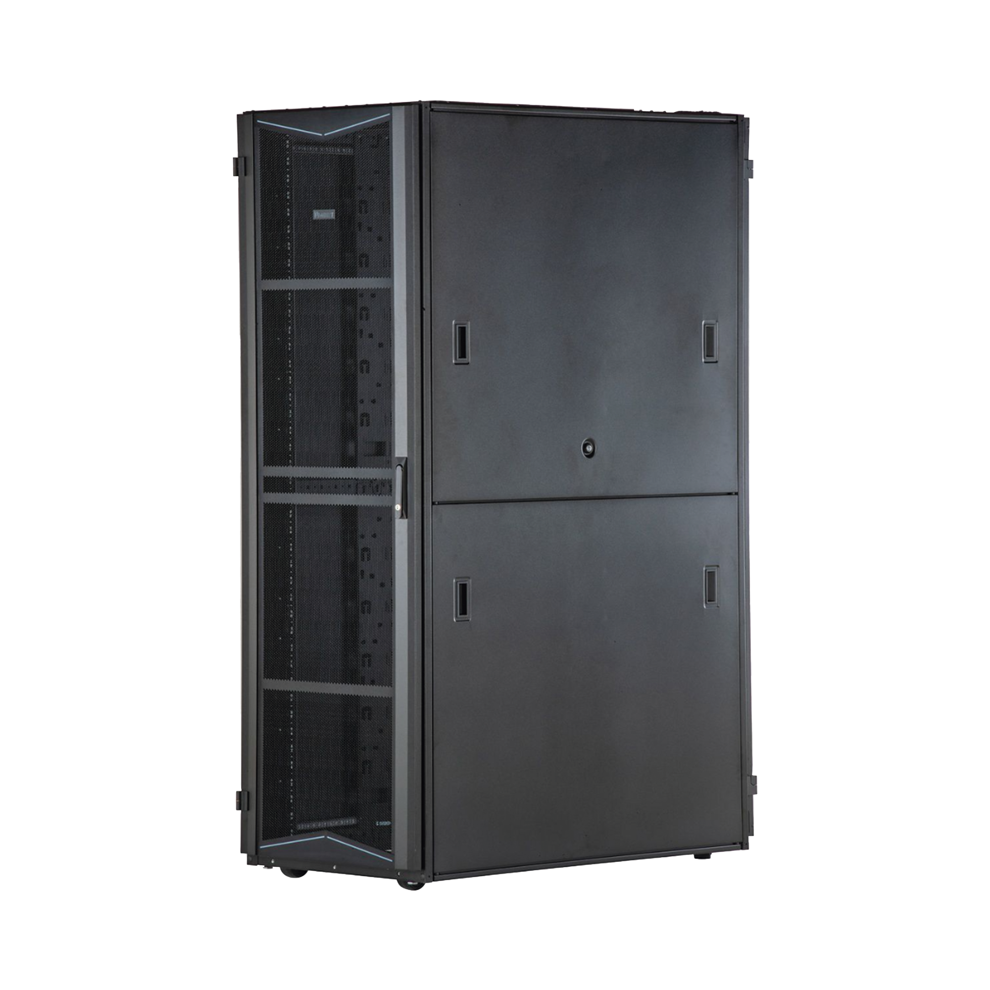 Los gabinetes FlexFusion™ constan de una estructura de acero ensamblada y soldada disponible en anchos de 600 mm, 700 mm y 800 mm, profundidades de 1070 mm y 1200 mm y alturas de 42 RU, 45 RU, 48 RU y 51 RU. Rieles delanteros y traseros totalmente ajustables con tuercas enjauladas. Las opciones disponibles incluyen una puerta delantera con una sola bisagra y puertas traseras con bisagras divididas con un 80% de perforación abierta, paneles laterales divididos horizontalmente, dedos para la gestión de cables, soporte para gestión de cables vertical, soporte de montaje de PDU y ruedas. Todo el gabinete debe esta conectado eléctricamente sin el uso de cables de conexión.