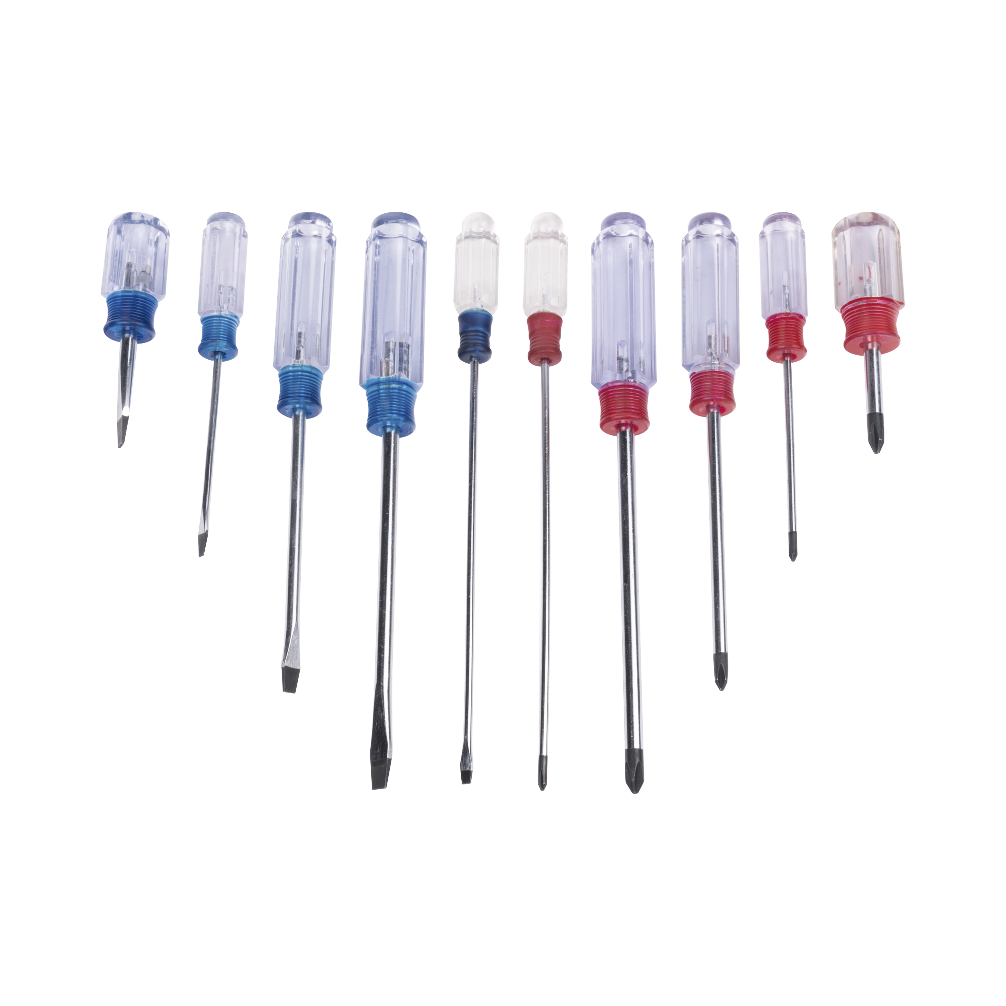 Juego de 10 desarmadores de mango de plástico, 5 punta plana y 5 punta phillips de tipo magnético.